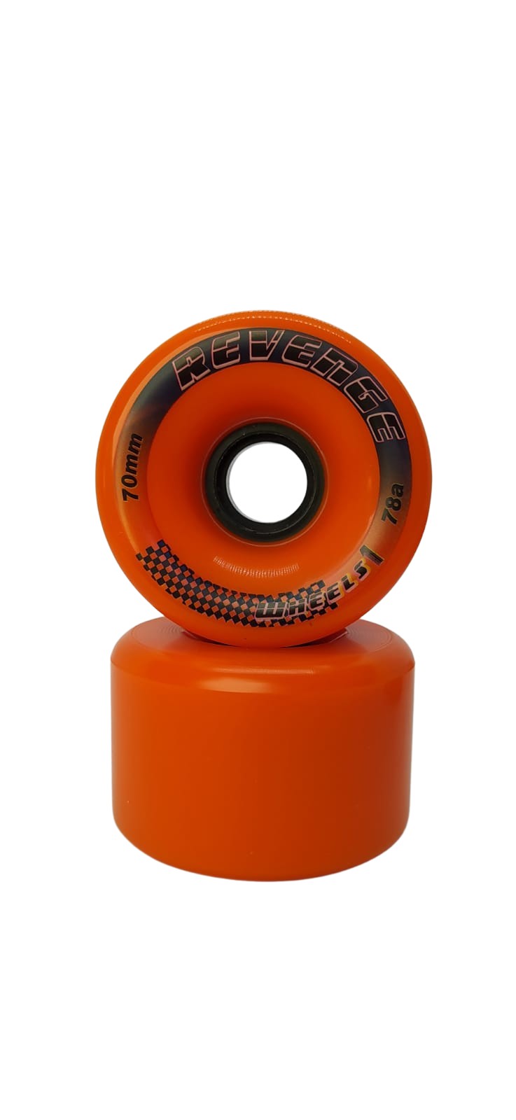 Tamanho: 70mm Dureza: 78A Cor: Laranja Kit: 04 rodas Marca: Revenge Wheels